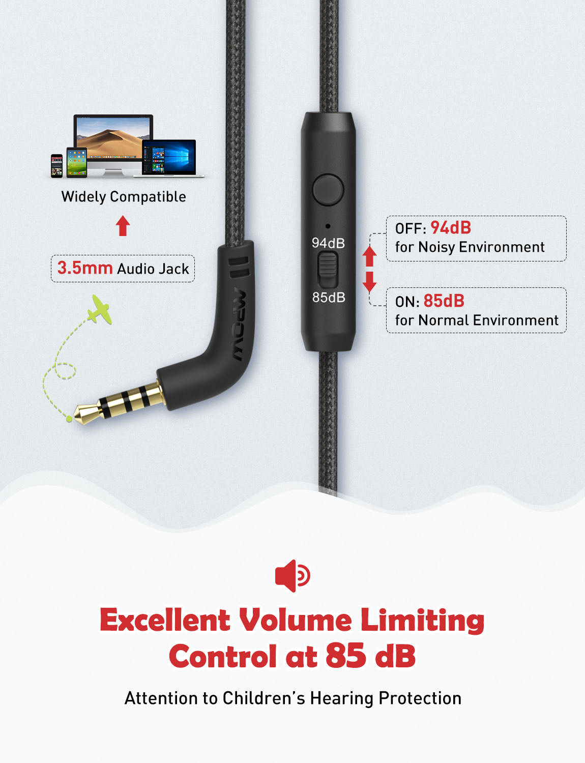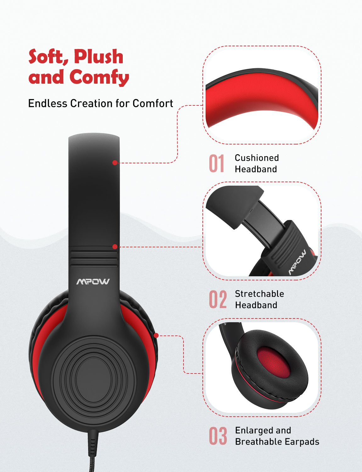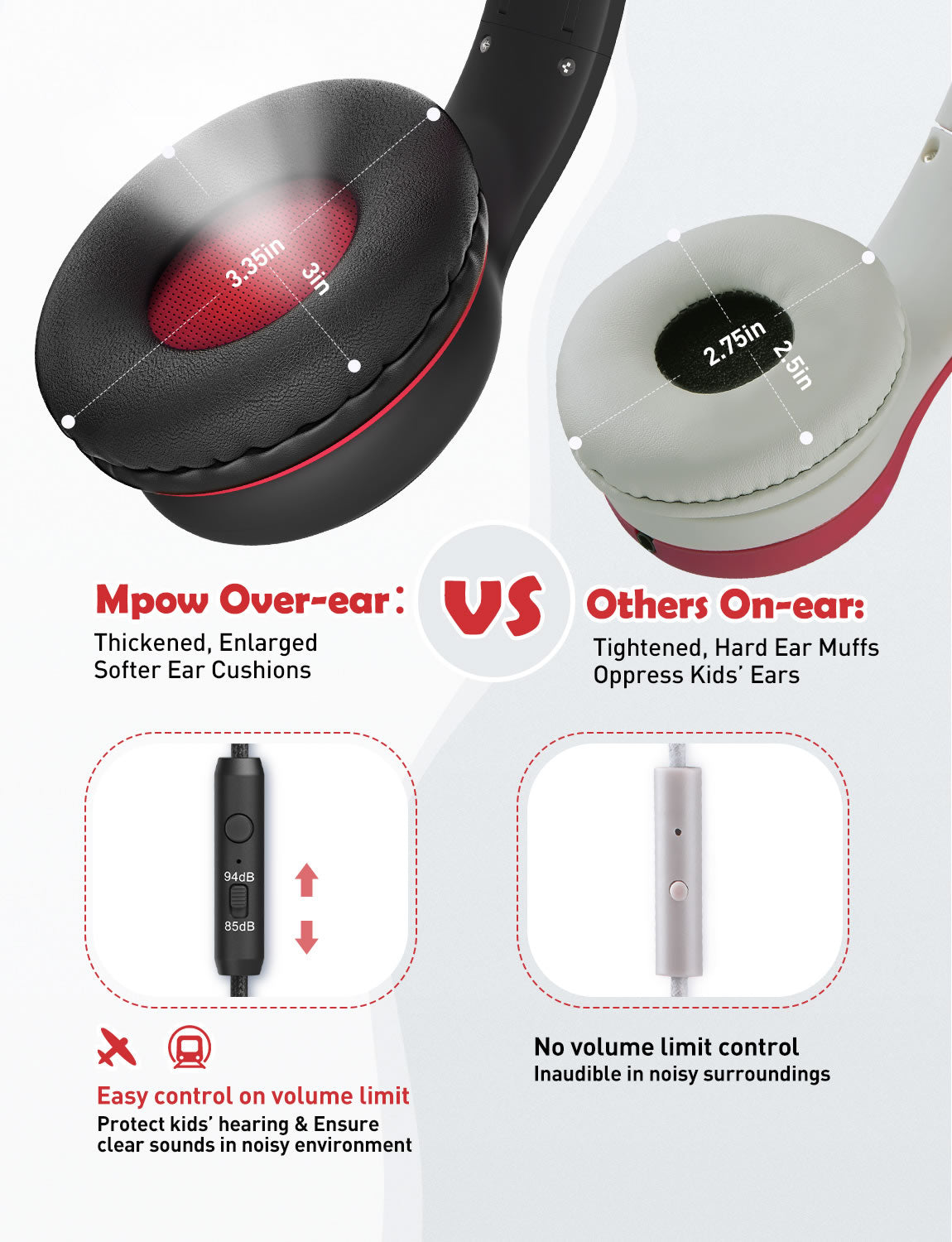 A Satisfying gift for the Kids Mpow Versatile Kids Headphones for Boys Girls Better Performance and More Comfortable for Kids - 3.5MM Jack - Sharing Audio In order to protect your child's hearing health, it is important to choose a high-quality wired kids headphones. Our kids headphones are designed with comfortable and soft ear cups, which effectively reduce external noise and allow children to immerse themselves in a clear world of music or online education. The specially designed 85/94db sound control technology ensures that the volume is within a safe range and avoids damage to children's ears.