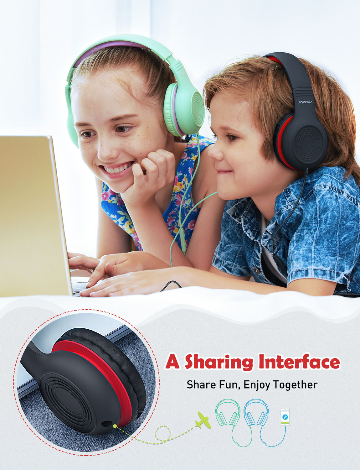 • 【Sharing Audio from the same Device 】If you have more than one child at home, you will definitely fall in love with this feature! Mpow kids' headphones have added a sharing function, which allows two headphones to share the received sound by connecting to the 3.5mm audio jack. Not only is it convenient for children to watch the same video course/listen to the same music, but it also enhances the relationship between children!