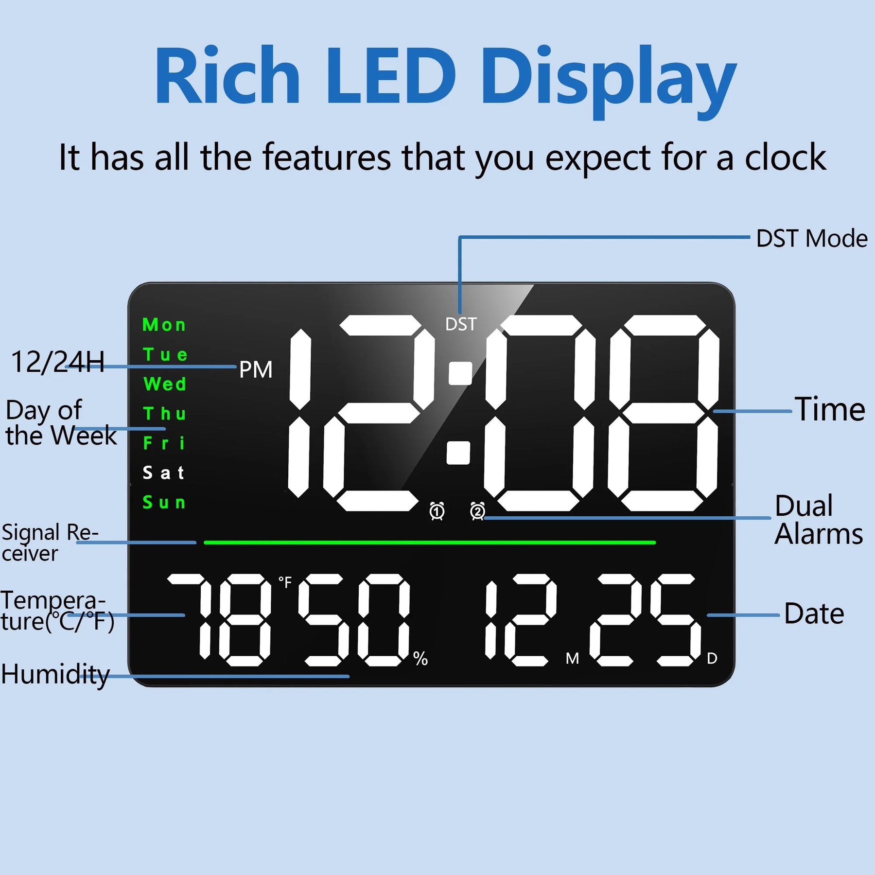 - Multi Functional Display: Not only does the calendar clock tell you the time, but it goes the extra mile to keep you informed. With the option to display the date, day of the week, temperature, and humidity, you'll have all the essential information at your fingertips. Plus, our clock offers both 12/24-hour time formats and ℃ or ℉ temperature formats, so you can customize it to your preference.