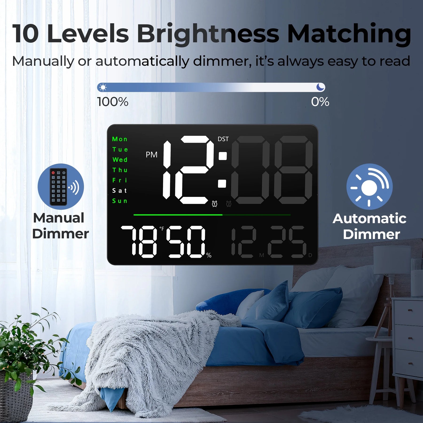 - Adjustable Brightness and Automatic Dimming Mode: This alarm clock for bedroom has 10 adjustable brightness levels and an automatic dimming mode. You can easily adjust the digital clock to your preferred brightness with the remote control, or just let it adjust the brightness automatically, which is very friendly for people who are sensitive to light when sleeping. It is clear enough during the day and can be dimmed at night without affecting your sleep.