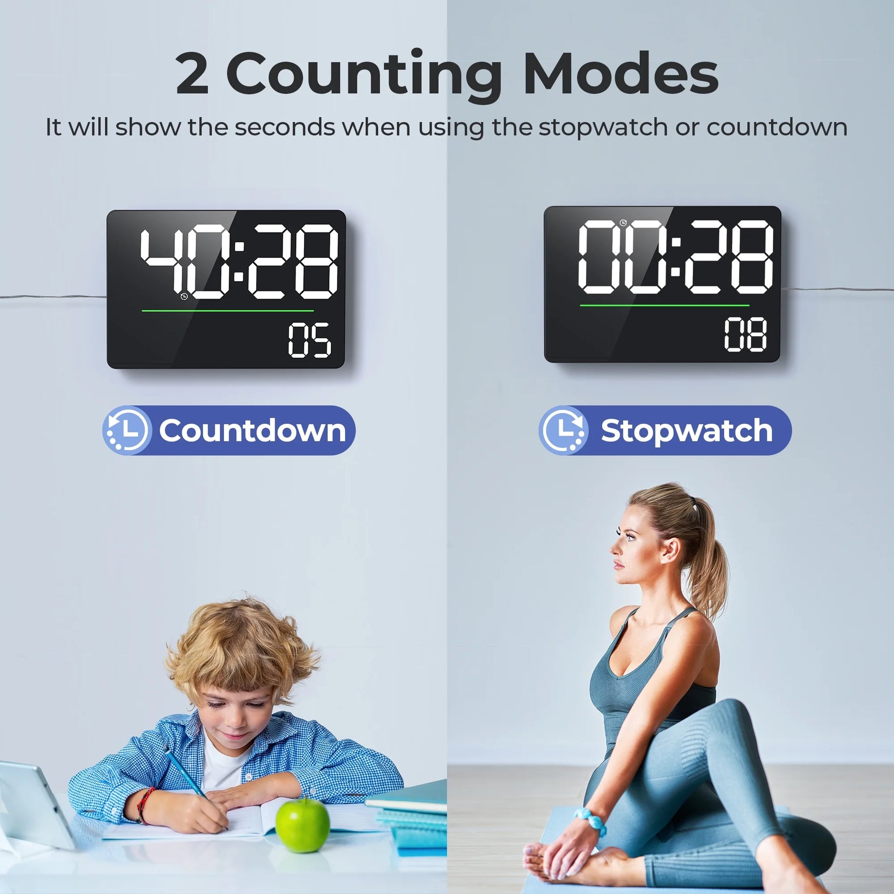 - Stopwatch and Countdown: This digital calendar clock includes a stopwatch and countdown function, which can help you improve work efficiency and is a good helper for fitness and study!